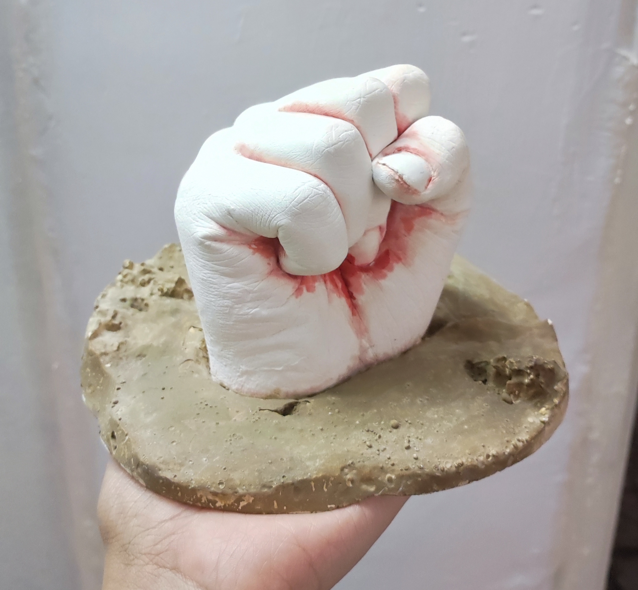 Ein genauer Abdruck der Hand mit hautfreundlichem Alginat, sorgfältig nachbearbeitet und bemalt, um die individuelle Struktur hervorzuheben.