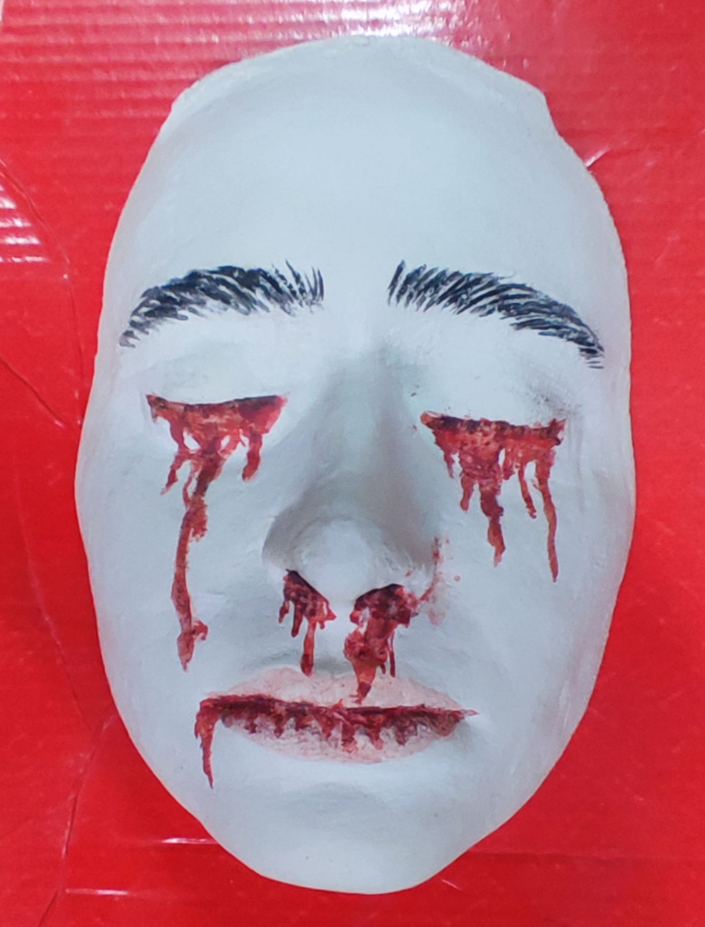 Mit Gipsbinden direkt vom Gesicht abgeformt, anschließend als Positivform ausgegossen, bearbeitet und von Hand bemalt, um Ausdruck und Charakter künstlerisch hervorzuheben.