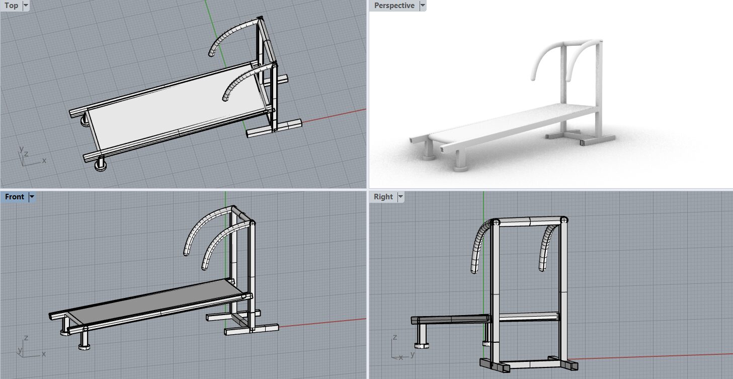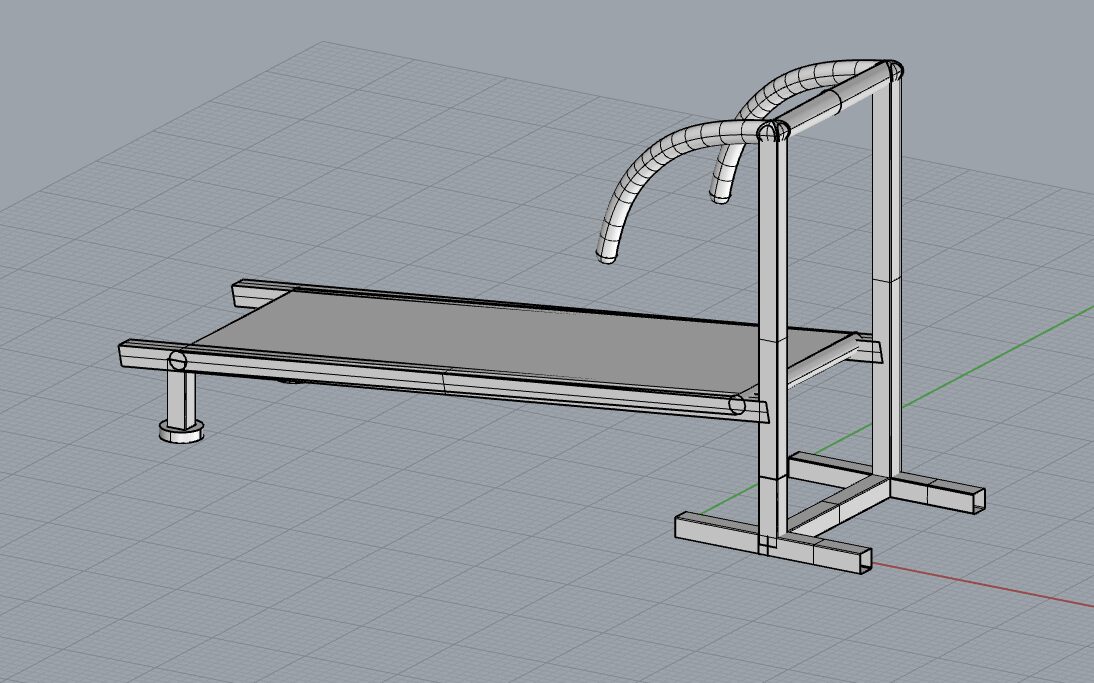 Nach der Skizzenphase wurde das Laufband in Rhino digital modelliert. Die 3D-Modellierung ermöglichte es mir, komplexe Bauteile genau zu planen und technische Details realitätsnah darzustellen. Durch präzise Geometrien und Renderings konnte ich Funktionalität, Materialien und Bauweise frühzeitig simulieren. Rhino bot die perfekte Umgebung, um das Konzept weiterzuentwickeln und für die Umsetzung vorzubereiten.