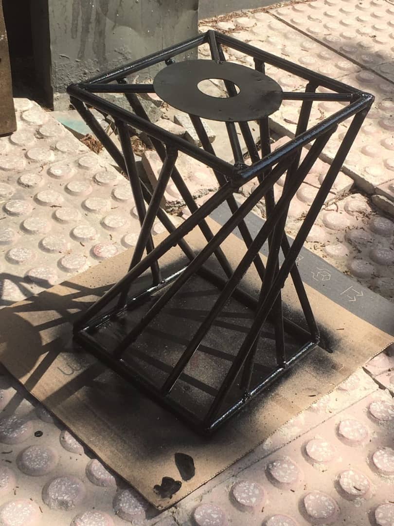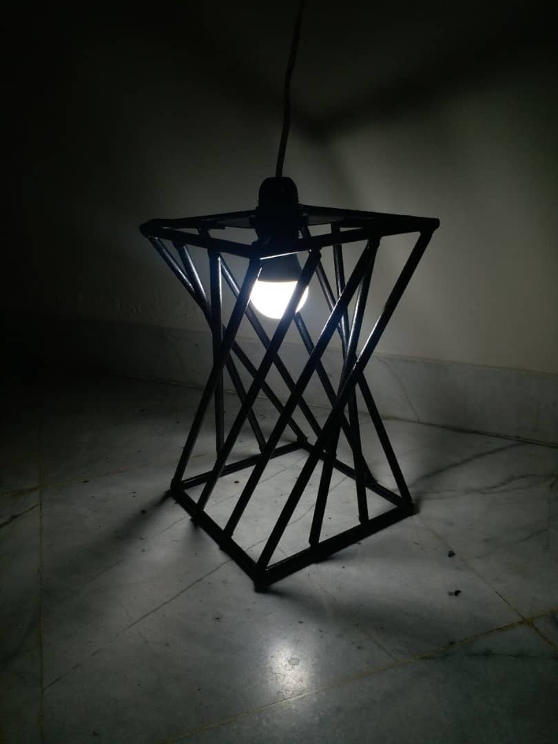 Diese Arbeit kombiniert Metallbearbeitung mit Lichtdesign. Durch präzises Zuschneiden, Messen und Schweißen wurde eine Konstruktion erschaffen, die sowohl als dekorative Lampe als auch als funktionale Leuchte dient.